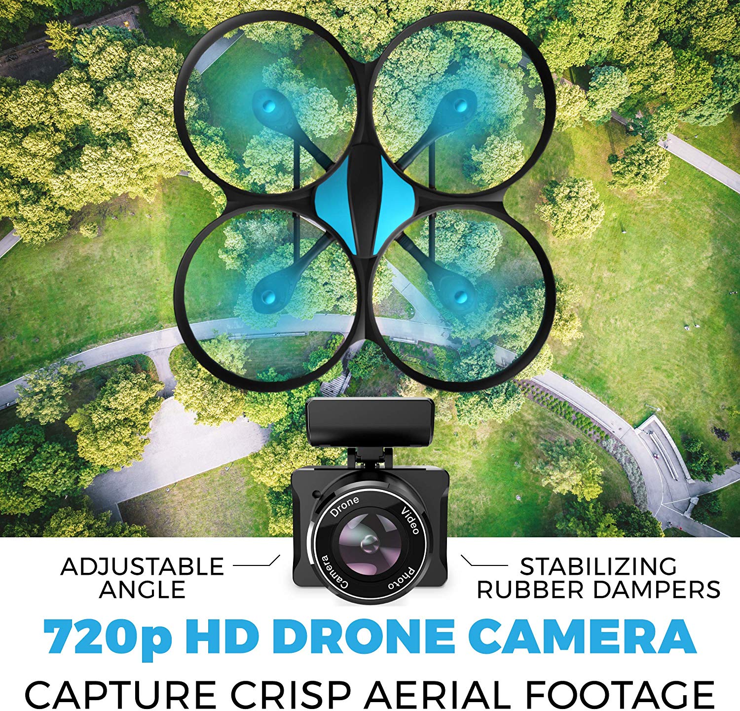 The [easyazon_link identifier=”B07GYZCXNZ” locale=”US” tag=”uavcoach-20″]U49WF[/easyazon_link] also has an FPV (first-person view) screen with Camera Live Video, so you can see exactly what the HD camera of your drone sees in real-time. It comes with an extra battery, to help you fly for even longer before having to charge, and a solid 720p camera for capturing clear HD still and video.