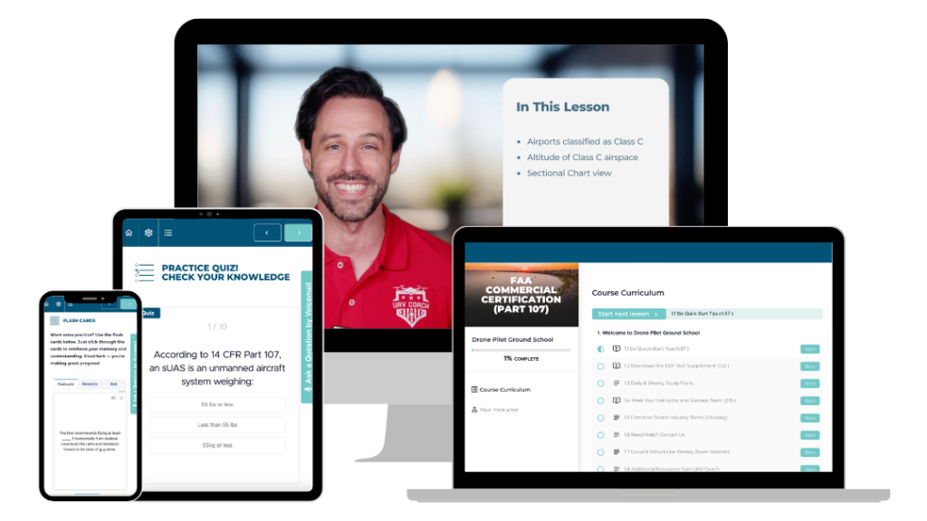 Learn at your own pace with 5.5 hours of step-by-step video lessons, plus exercises, quizzes, and resources that turn 15–20 hours of study into real-world knowledge for your Part 107 exam.