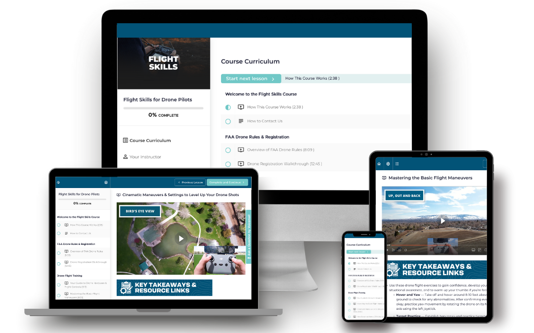 Inside the bundle, Drone Pilot Ground School prepares you for the Part 107 exam, Flight Skills for Drone Pilots builds your flight confidence, and Hands-on Flight Training gives you practical, in-person experience flying a drone.