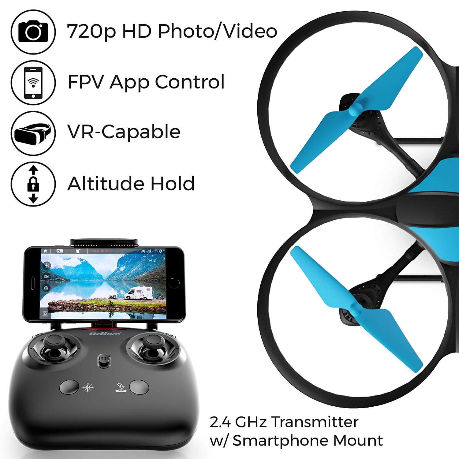 The [easyazon_link identifier=”B07GYZCXNZ” locale=”US” tag=”uavcoach-20″]U49WF FPV Camera Drone[/easyazon_link] boasts altitude-hold and a first-person-view (FPV) screen with Camera Live Video, so you can see exactly what the HD camera of your drone sees in real-time.