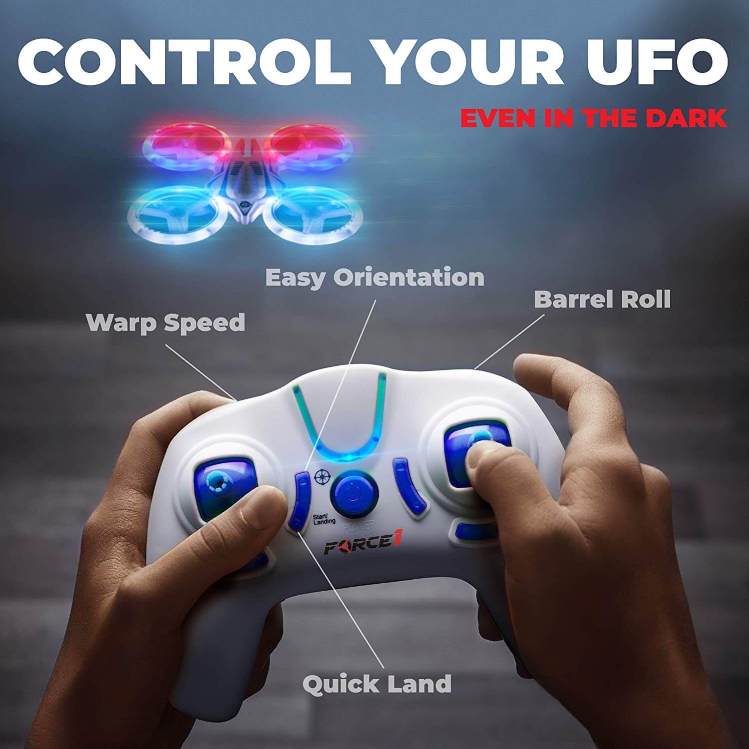 Propeller guards wrapped in LED lighting increase the durability and visibility of the drone and make this affordable drone great for beginners. The simple remote controller makes this drone perfect for all ages with 1-Key Start/Stop and easy joystick directional controls.